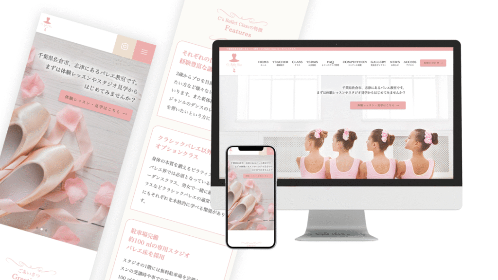 バレエ経験者の視点から、先生のこだわりや教室の雰囲気を丁寧にくみ取り、世界観に合ったデザインをご提案いたします。デザイン性だけでなく、SEOや導線設計など集客につながるポイントも意識した、実用性の高いホームページを制作しています。全国のバレエ教室さまからご依頼をいただいており、初めての方でも安心してご相談いただけます。